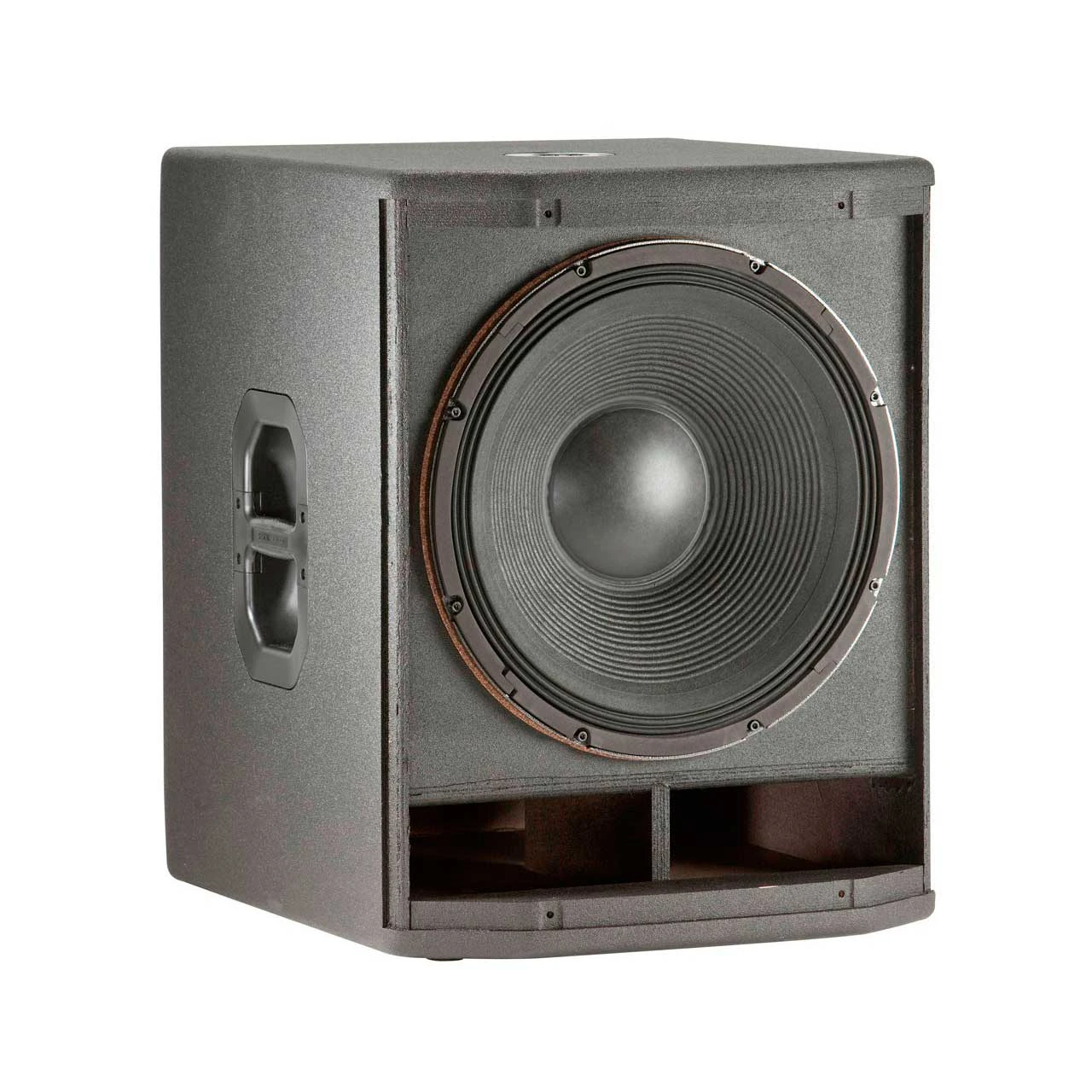 Compact 18″ portable subwoofer system; 35Hz Frequency Range, 2400 watt peak power handling, 130dB Max SPL, cloth-backed steel grille M20 pole socket, non-skid rubber feet, Net Weight 33.5kg (74 lbs.)