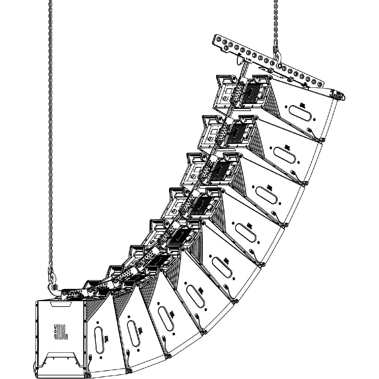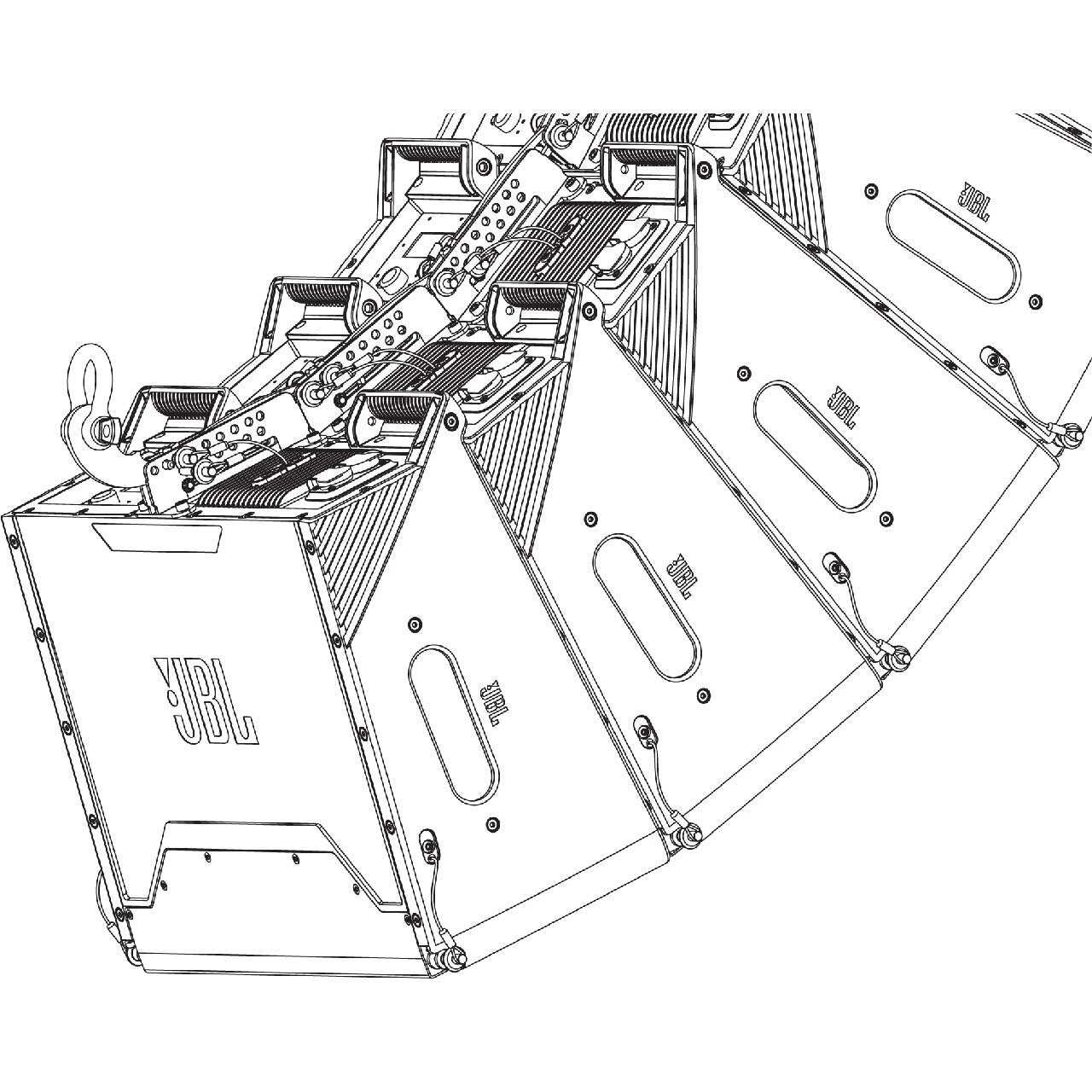 The JBL SRX906LA PB accessory is a lightweight pull-back bracket that can be used to implement pull-back of SRX906LA or SRX910LA arrays. The SRX906LA PB attaches to the bottom cabinet of an array and connects to a rear center suspension point to allow for more downtilt than would otherwise be possible using an SRX900 Series array frame alone. JBL’s Line Array Calculator 3 software application is used to calculate the required downtilt angle. The SRX906LA PB can support the weight of up to 16 SRX906LA or 16 SRX910LA enclosures (depending on array geometry) and a 1/2-inch shackle (included) can be attached directly to the bracket. For more information about the suspension bar and use cases, refer to the SRX900 Series Rigging Manual.